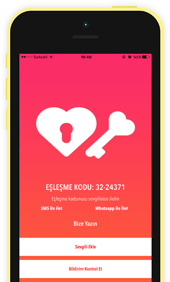 "Mervelerdeyim aşkım", "Arkadaşlarla pes oynuyoruz" dönemi sona eriyor :) Tamamen ücretsiz olan ve sosyal ağ hesaplarınızla ilgilenmeyen uygulamamız; sadece onay kodu mantığı ile çalışıyor. Uygulamayı açtığınız zaman size verilen kodu eşinize iletin; eşleşmeyi başlatın. Arkaplanda bulunan görsel eve dönüştüğü zaman artık hazırsınız demektir. Günlük sorgu limiti olmadan, istediğiniz kadar yer bildirimi talep edebilirsiniz.