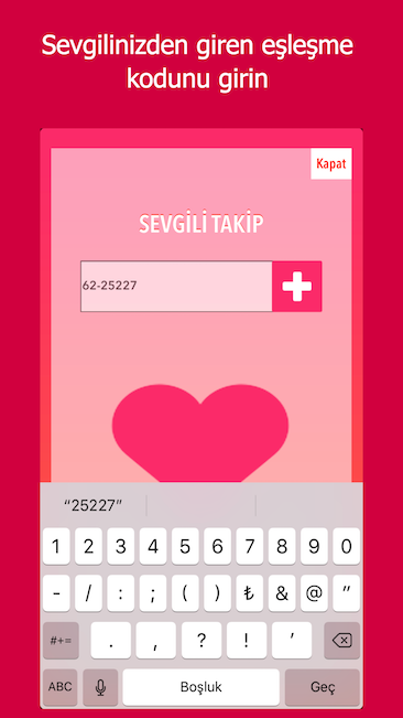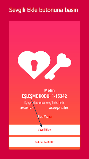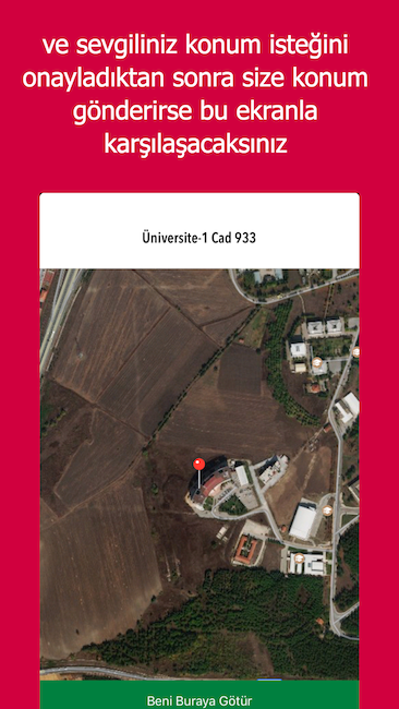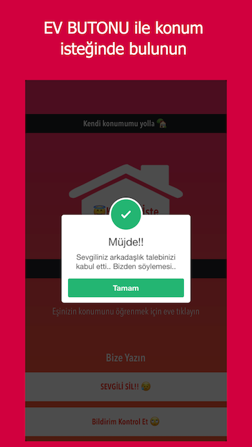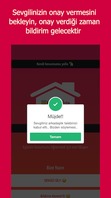 "Mervelerdeyim aşkım", "Arkadaşlarla pes oynuyoruz" dönemi sona eriyor :) Tamamen ücretsiz olan ve sosyal ağ hesaplarınızla ilgilenmeyen uygulamamız; sadece onay kodu mantığı ile çalışıyor. Uygulamayı açtığınız zaman size verilen kodu eşinize iletin; eşleşmeyi başlatın. Arkaplanda bulunan görsel eve dönüştüğü zaman artık hazırsınız demektir. Günlük sorgu limiti olmadan, istediğiniz kadar yer bildirimi talep edebilirsiniz.